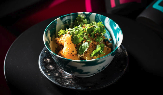 Актуальное меню в заведении небольшое – закуски изакая, роллы, домашняя лапша, темпура. Однако каждая позиция доведена до серьезного уровня, все-таки, заведение – не обычная закусочная, а полноценное гастробистро. Так роллы делают открытыми, корейские токпокки заправляют зеленым карри, лепешку роти начиняют креветкой и щедро приправляют чили, цыпленка карааге сервируют с юдзу айли, а телятину кушияки подают с бамией. Отдельного упоминания заслуживает ананас кимчи с невероятно экспрессивным вкусом, где яркая сладость тропического фрукта гармонизирована довольно острым соусом.