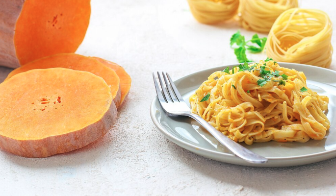 Шаг 7: Разложите пасту по тарелкам, сверху выложите ароматный тыквенный соус и посыпьте оставшимся тертым сыром. Подавайте горячим!