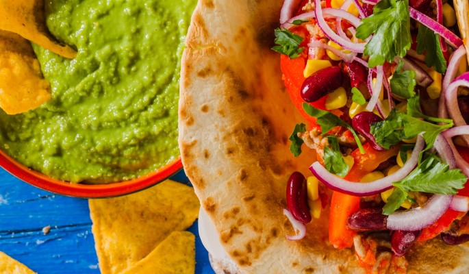 - На каждую тортилью выложите слой гуакамоле, затем фасоль. Заверните тортилью в рулет или сложите пополам.