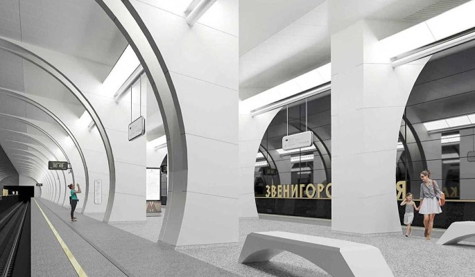 Станция «Звенигородская» строится в рамках первого этапа создания Рублево-Архангельской линии метро. К настоящему времени готовы основные конструкции платформы, возводятся оба вестибюля. На нижних отметках комплекса и на платформе уже ведутся черновые архитектурно-отделочные работы, параллельно идет подготовка к устройству инженерных сетей.