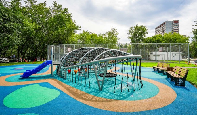 Здесь юные горожане могут забираться по канатам, проходить веревочную полосу препятствий, кататься на разнообразных качелях и весело съезжать с горки. Покрытие площадки выполнено в оттенках морской волны. Для игр и спортивных занятий рядом предусмотрены универсальная спортивная площадка, уличные тренажеры, скейт-парк и даже батут, а для отдыха установлены удобные лавочки.