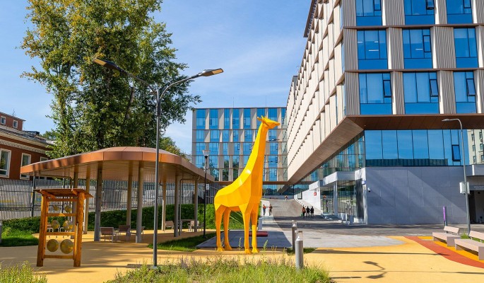Особого внимания заслуживает обновление территории нового корпуса детской городской клинической больницы святого Владимира. Здесь создали гармоничную среду, где сочетаются практичность и эстетика: появились пышные зеленые насаждения, яркая детская площадка и зона отдыха с удобными скамейками. Здесь также проложили пешеходные дорожки, установили современное уличное освещение и разместили малые архитектурные формы, которые добавили пространству индивидуальности. Такое решение позволяет маленьким пациентам и их родителям отвлечься от больничной атмосферы, выходя на воздух.